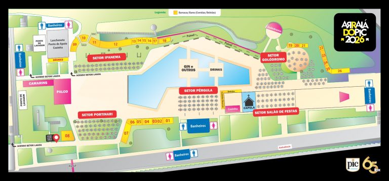 Todas as mesas do mapa estão disponíveis para compra (exceto as mesas do Setor Lagoa que são gratuitas). As mesas são disponibilizadas com seis lugares e serão vendidas cadeiras em mesas com valores diferentes por cada setor. Taxa já inclusa no ingresso com cadeira.