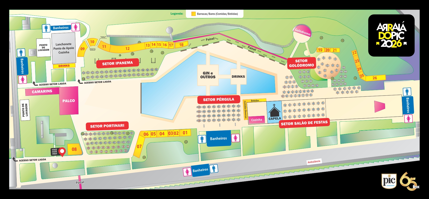 Todas as mesas do mapa estão disponíveis para compra (exceto as mesas do Setor Lagoa que são gratuitas). As mesas são disponibilizadas com seis lugares e serão vendidas cadeiras em mesas com valores diferentes por cada setor. Taxa já inclusa no ingresso com cadeira.